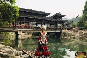 为栏杆型水泥桥,是寨内老少憩息、聚会和留客的地方。桥边竹林青翠,桥下流水潺潺。西江苗寨四周被枫香树、杉树和青松围绕。